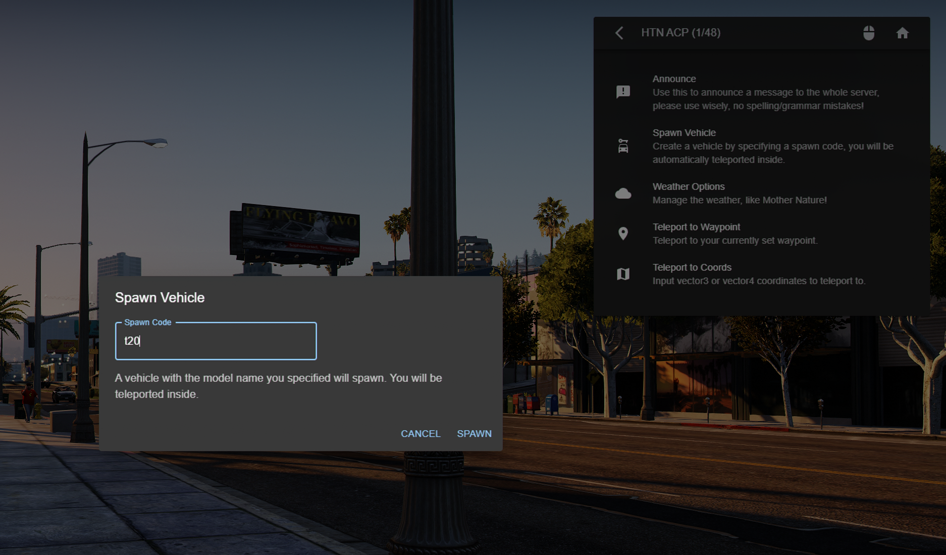| Spawn Vehicle | F10 → Staff Commands → Spawn Vehicle |