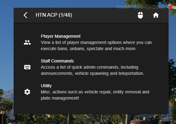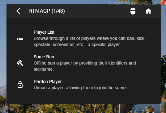 View a list of player management options where you can execute bans, unbans, spectate, and much more.