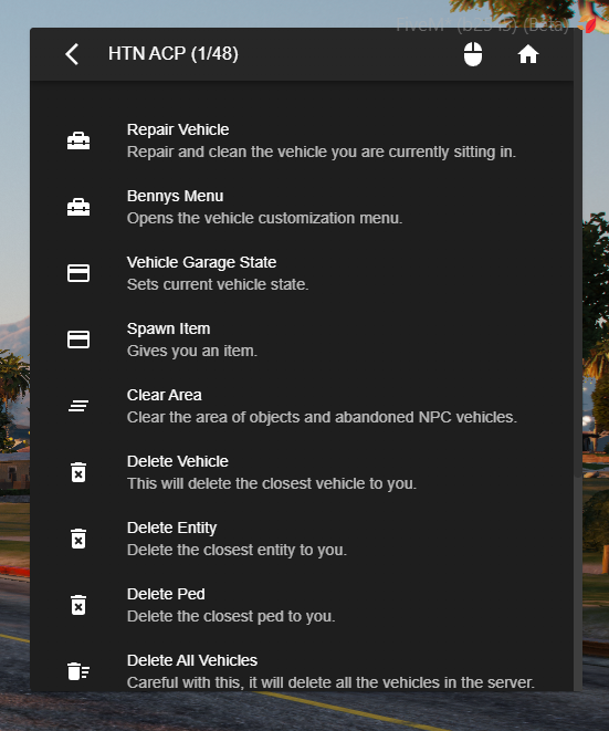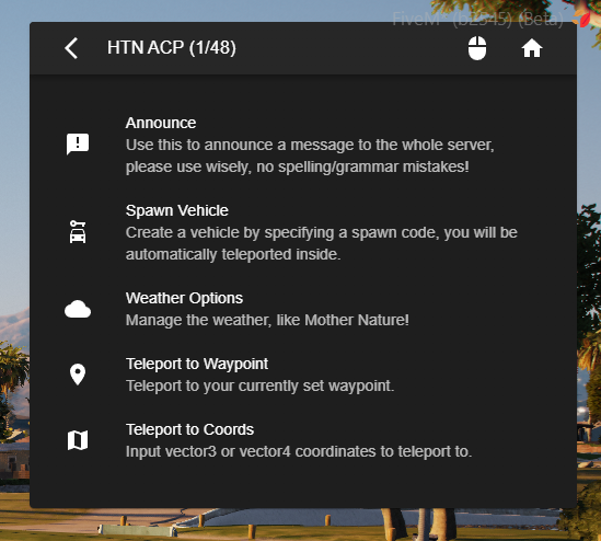 Access a list of quick admin commands, including announcements, vehicle spawning, and teleportation.